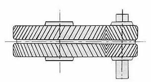 Engranajes helicoidales dobles Los engranajes "espina de pescado" son una combinación de hélice derecha e izquierda. El empuje axial que absorben los apoyos o cojinetes de los engranajes helicoidales es una desventaja de ellos y ésta se elimina por la reacción del empuje igual y opuesto de una rama simétrica de un engrane helicoidal doble.